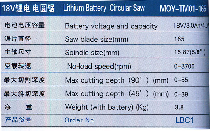 18V锂电 电圆锯 MOY-TM01-165